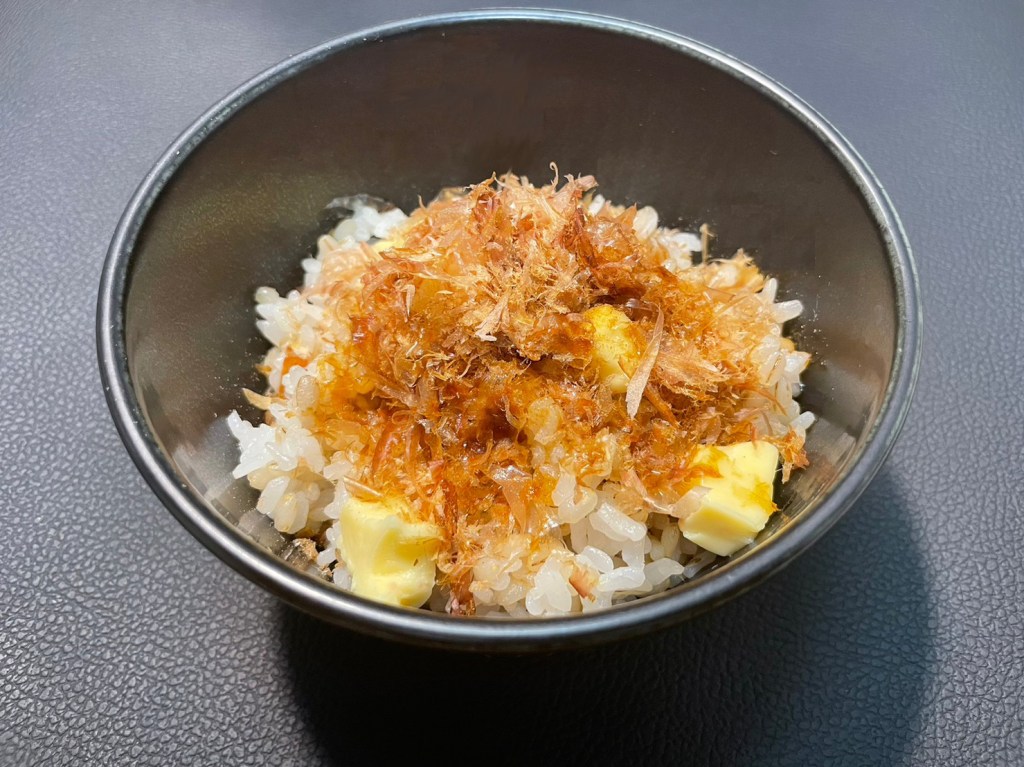 ②ご飯の上(①)に、かつお節をのせる。