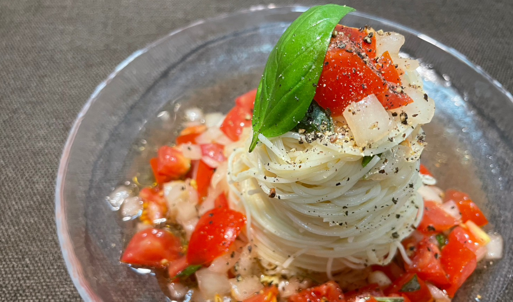 前回ご紹介した『冷やして美味しい。トマトマリネ』を使った、『冷製トマトパスタ』ご紹介します。